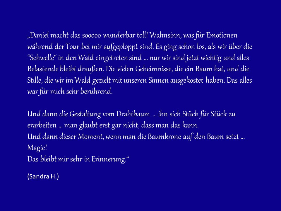 Ich bin Daniel, ausgebildeter Waldführer und Naturführer, Diplom-Sportwissenschaftler und Mentor. Gerne nehme ich euch mit, um mit mir im Großraum München und Bayern in den Wald und das Leben der Bäume und der dazugehörigen Flora und Fauna einzutauchen.